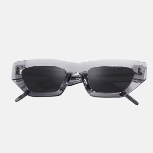 The lenses are crafted from acrylic, a material known for its clarity and shatter-resistance. The dark tint of the lenses provides a sleek contrast against the white frames, enhancing the overall aesthetic and adding a touch of classic sophistication to these modern sunglasses.