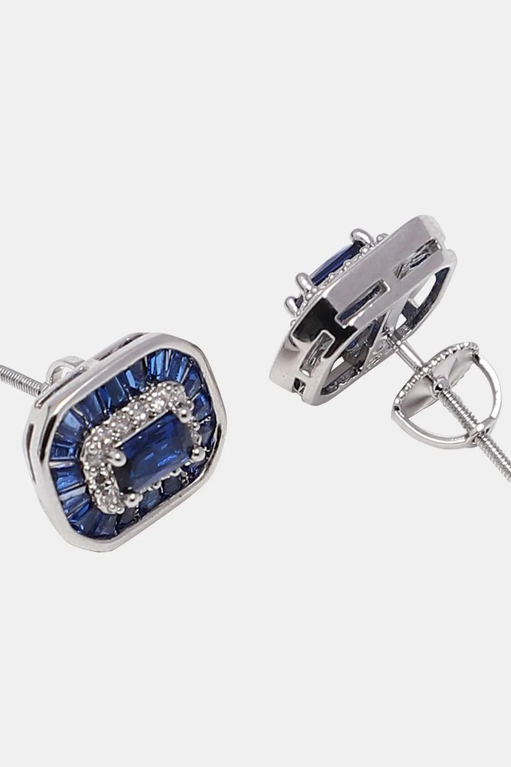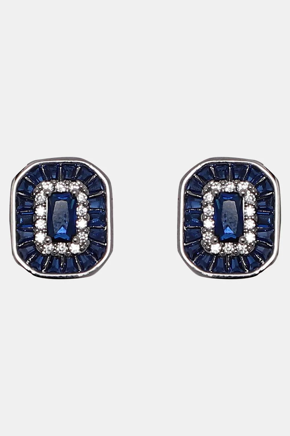 Each earring features an intricately designed pattern that centers around a vibrant blue crystal. The crystal, with its deep azure hue, evokes a sense of timeless elegance and chic simplicity. Surrounding the crystal are smaller clear synthetic gems that add a sparkling contrast, creating a striking visual appeal. The stunning arrangement of stones ensures these earrings remain a statement piece, capable of elevating any outfit from ordinary to extraordinary.
