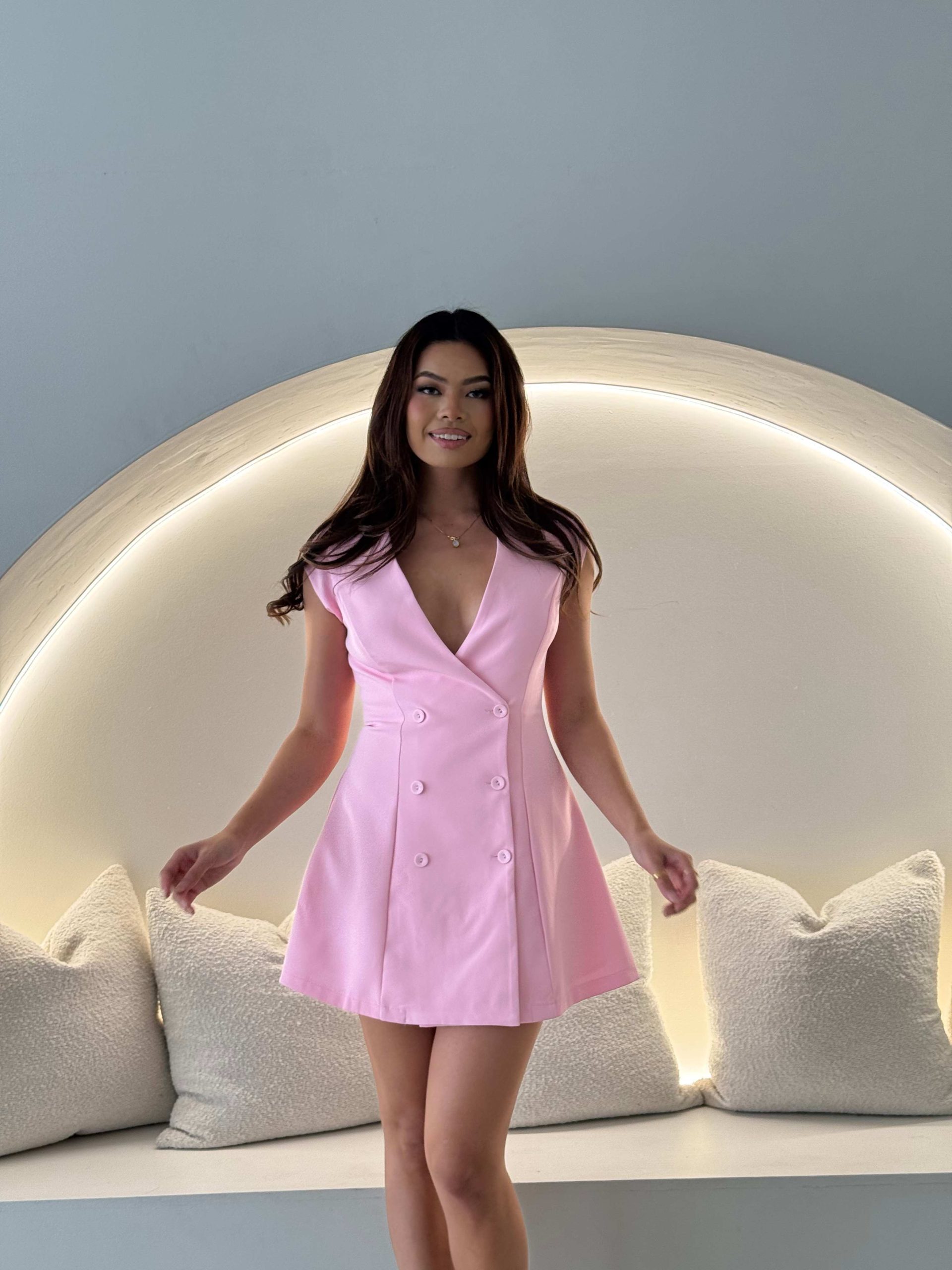 The Elegant Pink Double-Breasted Dress is perfect for those who wish to express their style with a touch of class and playfulness. Whether you’re attending a brunch, a date night, or any other occasion, this dress is sure to make you stand out with its sweet color and fashionable design.